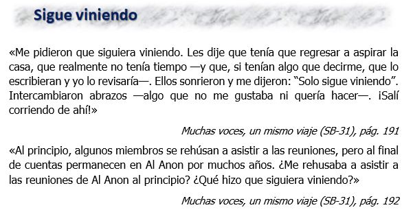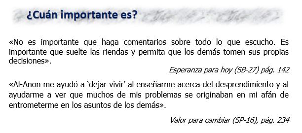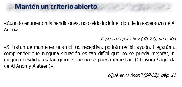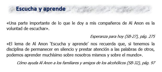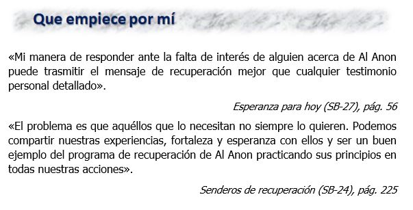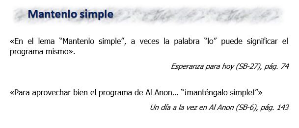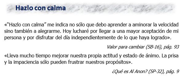 «A diferencia de algunos principios y prácticas de Al‑Anon cuyo aprendizaje y aplicación llevan un cierto tiempo, los lemas de Al‑Anon son fáciles de aprender y recordar. Quizás los hayan escuchado cientos de veces antes sin tomarlos seriamente o ponerlos en práctica. Después de todo, son frases estereotipadas que se descartan con facilidad; pero es su simpleza lo que los hace tan poderosos».